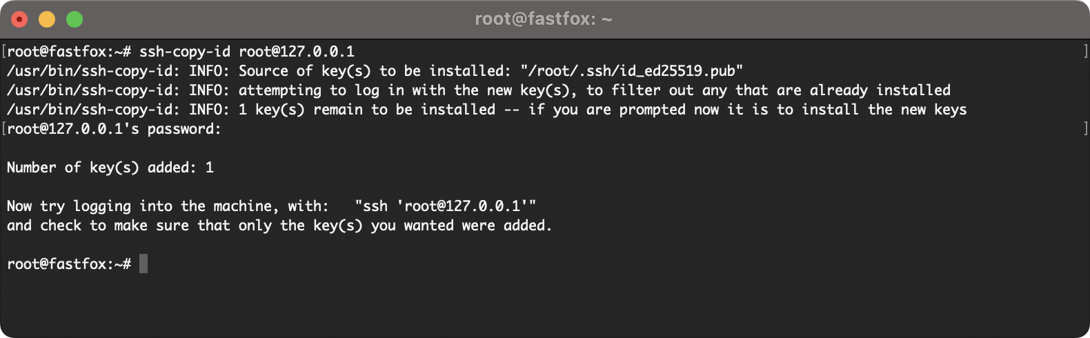 В результате содержимое файла с публичным ключом id_ed25519.pub будет скопировано в файл ~/.ssh/authorized_keys на сервере, и в дальнейшем вы сможете устанавливать соединение с сервером без ввода пароля.